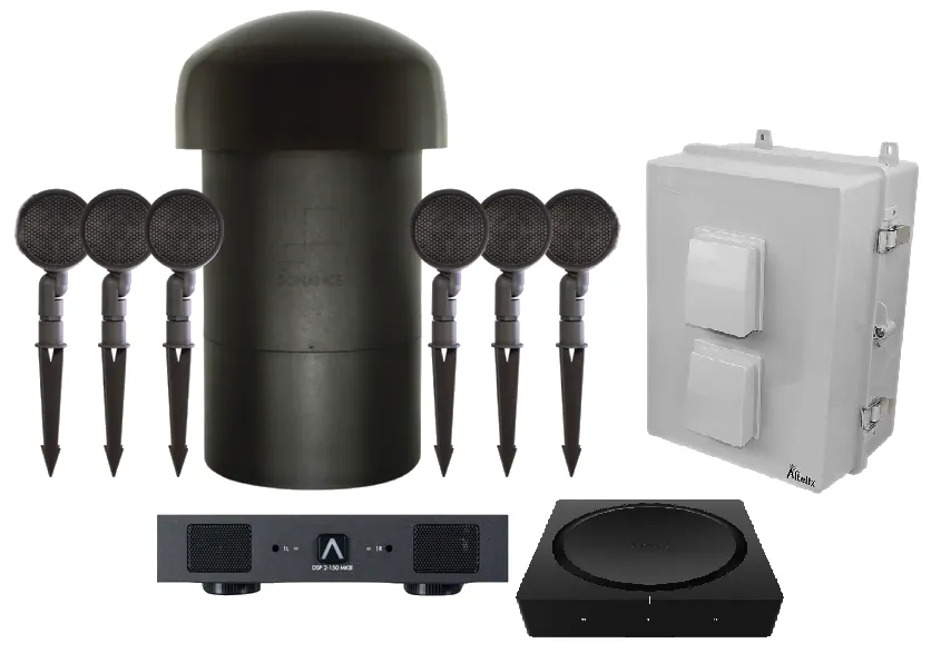 Includes 6 speakers, 1 subwoofer, 1 amp with outdoor enclosure, an app streaming system